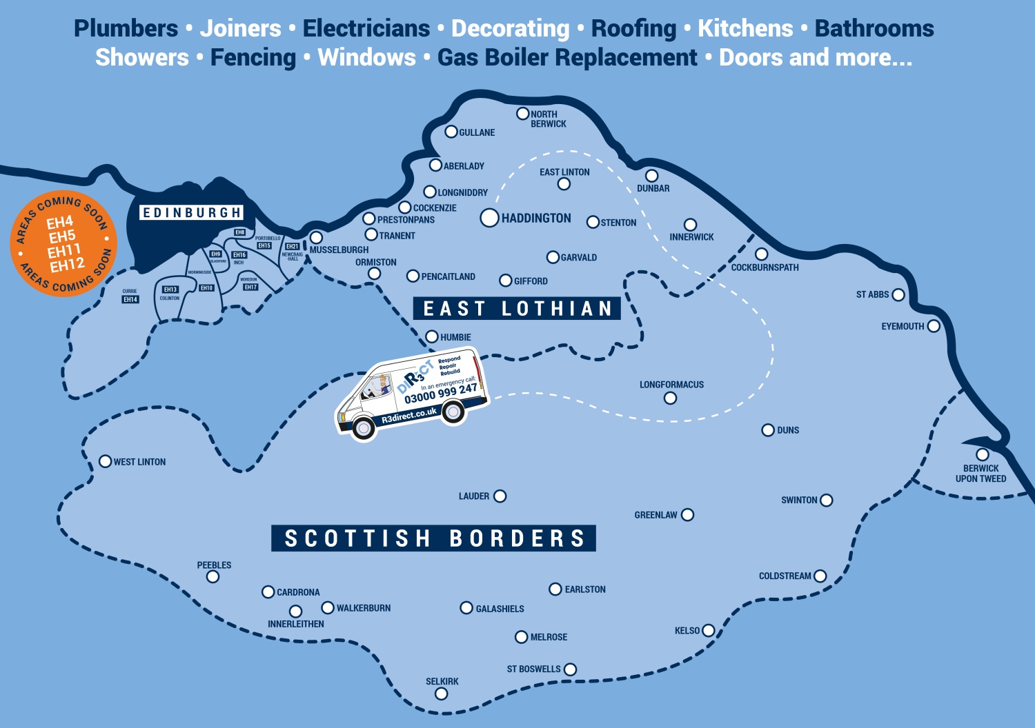 R3 DIRECT is available to all East Lothian residents. A dedicated and experienced team of skilled tradesmen are on hand to ensure your repair or construction project is completed to your satisfaction.